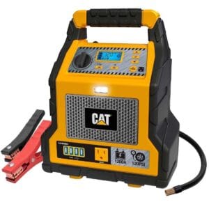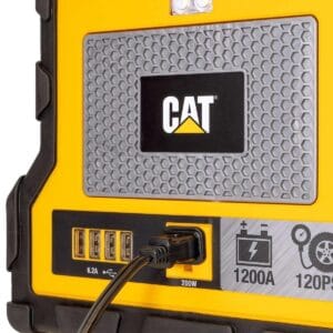 With the CAT CJ1000DXT Jump Starter and Power Station, you ve always got roadside assistance within arm s reach. Featuring integrated jumper cables and a 1200 peak amp jump starter, it s powerful enough to start up even large V8-powered cars and trucks. The 120 PSI automatic compressor helps you top off tires at the push of a button thanks to the digital display & AutoStop functionality. And the built-in 200-watt portable power inverter is ideal for recharging personal electronics and providing household 120V AC power on-the-go. User-friendly with an integrated safety switch and reverse polarity alarm, the CAT CJ1000DXT is a powerful 3-in-1 upgrade for your family vehicle or work truck.