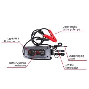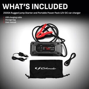 – In the Box The Schumacher 2500A Rugged Lithium Jump Starter and USB Power Pack, 12V DC car charger, USB charging cable, carry bag, and user manual.