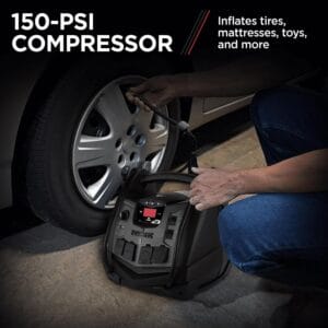 – Air Compressor The 150-PSI air compressor features a digital gauge for easy use and multiple accessory nozzles. Eliminate the headache of inflatable items with the companion inflator/deflator.