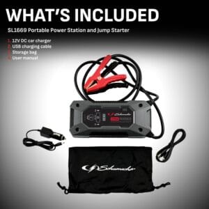 – New in Box The Schumacher SL1669 1750A Rugged Lithium Jump Starter and USB Power Pack, 12V DC car charger, USB charging cable, carry bag, and user manual.